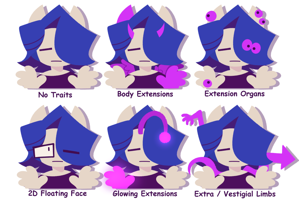 Due to being so broad, there are no visuals for these! Only descriptions! Examples of "Extra" traits would include: